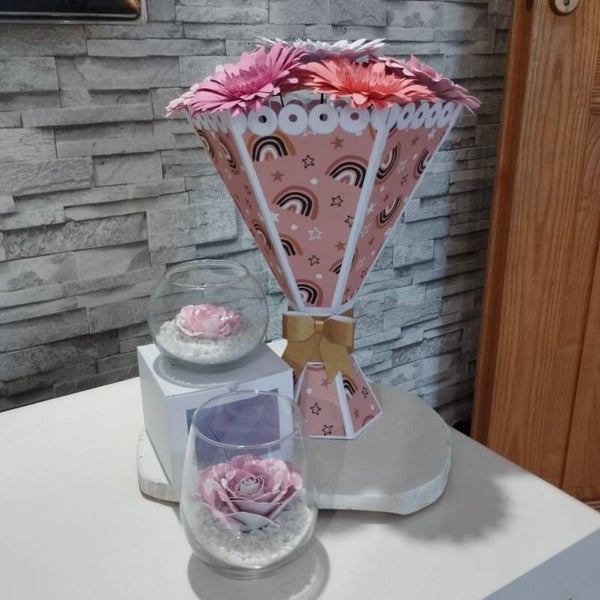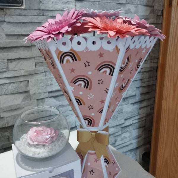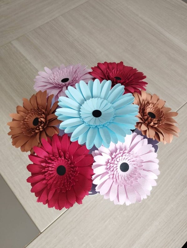 Les fleurs et le socle sont fabriqués artisanalement. Le papier est majoritairement du papier Clairefontaine.