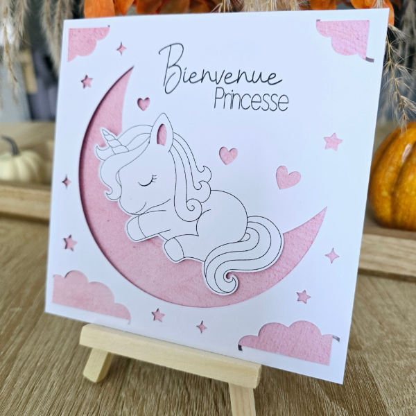 - Design : Une adorable licorne endormie sur une lune rose, entourée de petits cœurs et d'étoiles. Le message "Bienvenue Princesse" est inscrit en haut avec une élégante typographie manuscrite.