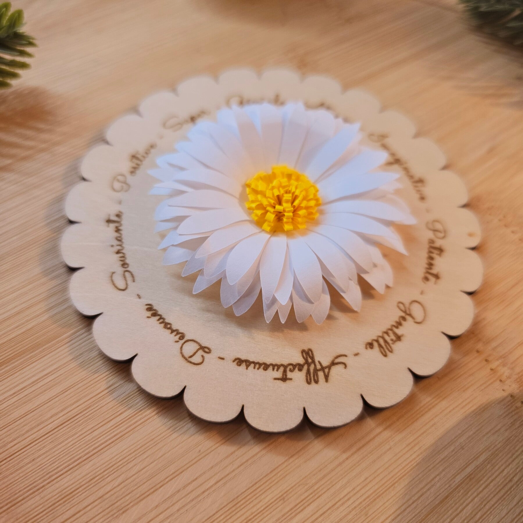 Fleur en papier faite main, montée sur un support en bois gravé de mots doux (douce, patiente, bienveillante…).