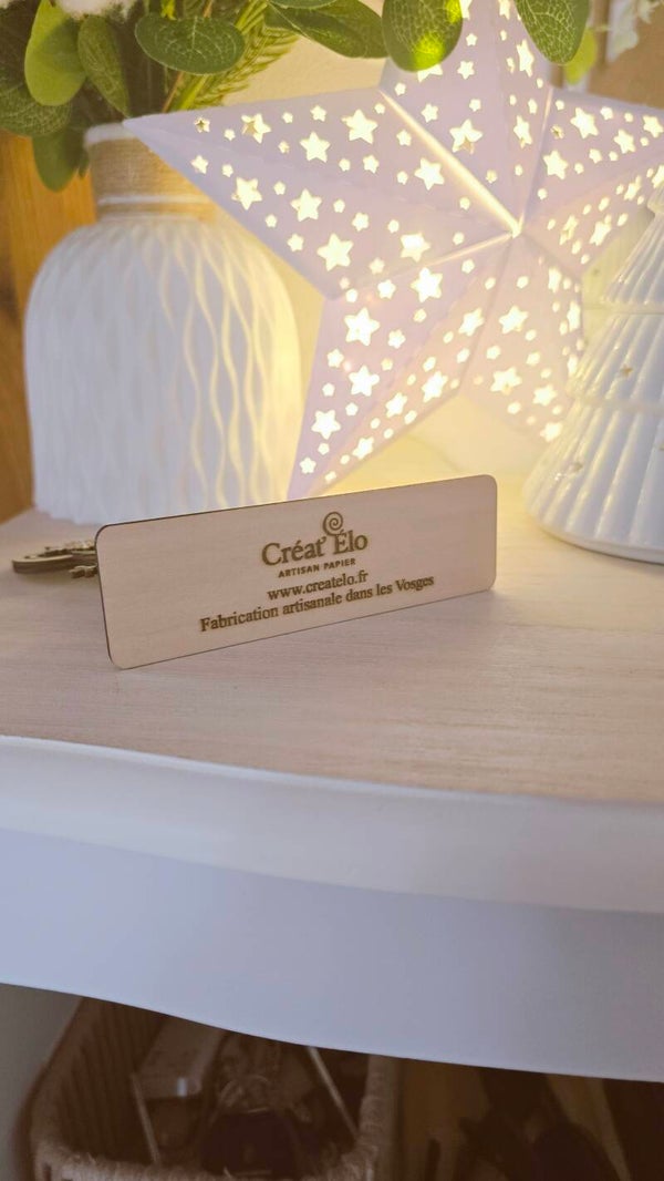 Matériaux : Bois découpé au laser et papier artisanal (vert sauge et rouge Noël)