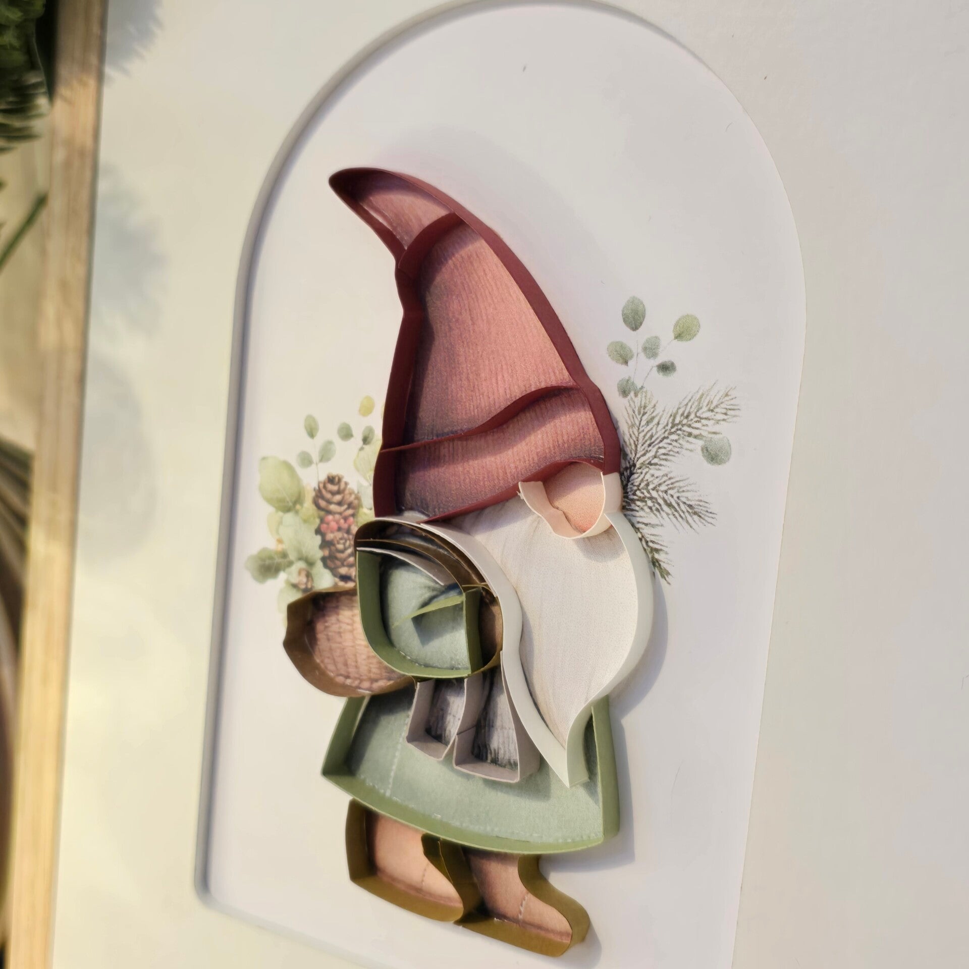Apporte une touche de magie et de douceur à ta décoration de Noël avec ce adorable gnome rouge, entièrement réalisé en quilling (papier roulé). Son bonnet pointu, sa grande barbe blanche et ses détails minutieux en font une création pleine de charme, idéale pour sublimer ton intérieur durant les fêtes.