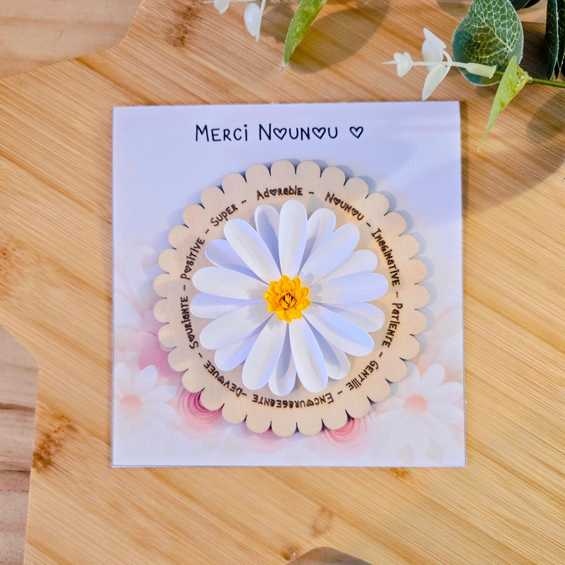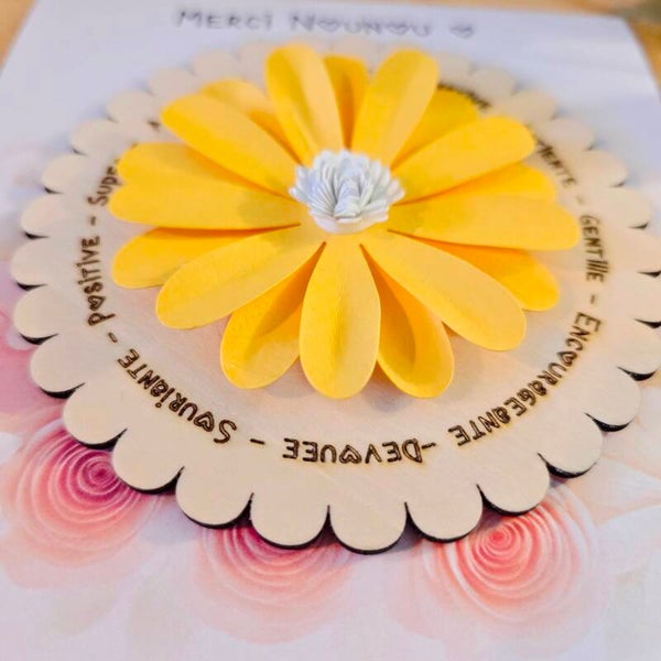 Matériaux : Bois découpé au laser et fleur en papier façonnée à la main.