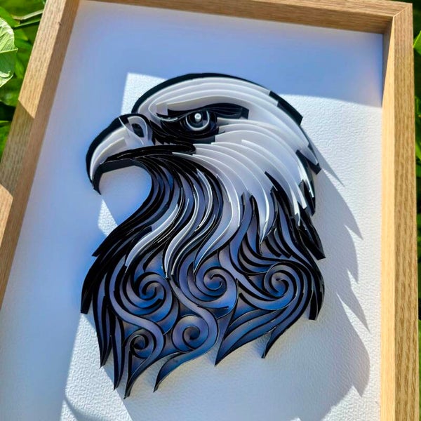 Ajoutez une touche artistique et pleine de caractère à votre intérieur avec ce cadre représentant une majestueuse tête d’aigle réalisée en quilling.