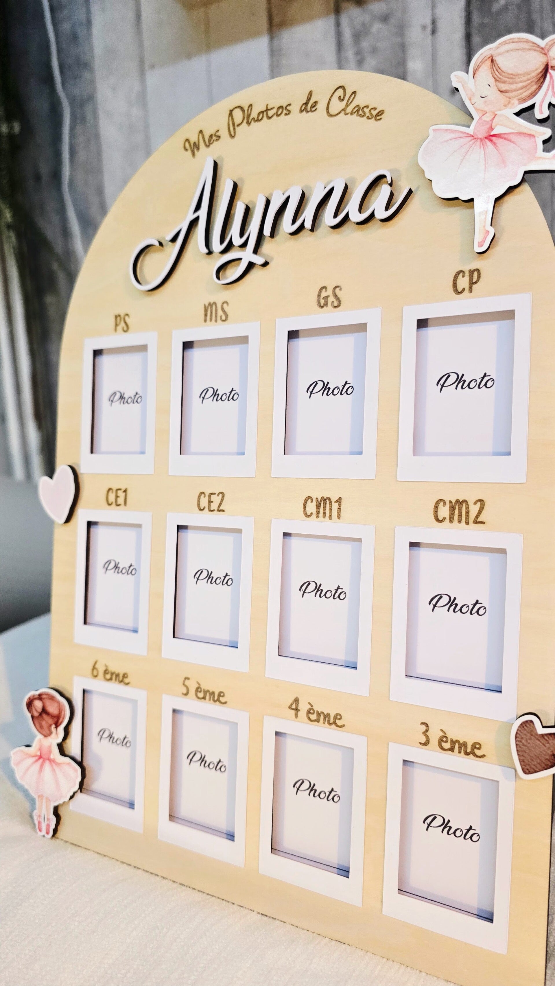Conservez tous les souvenirs scolaires de votre enfant sur une seule et même création avec cette jolie plaque photos de classe en bois, à la fois décorative, pratique et pleine d’émotion.