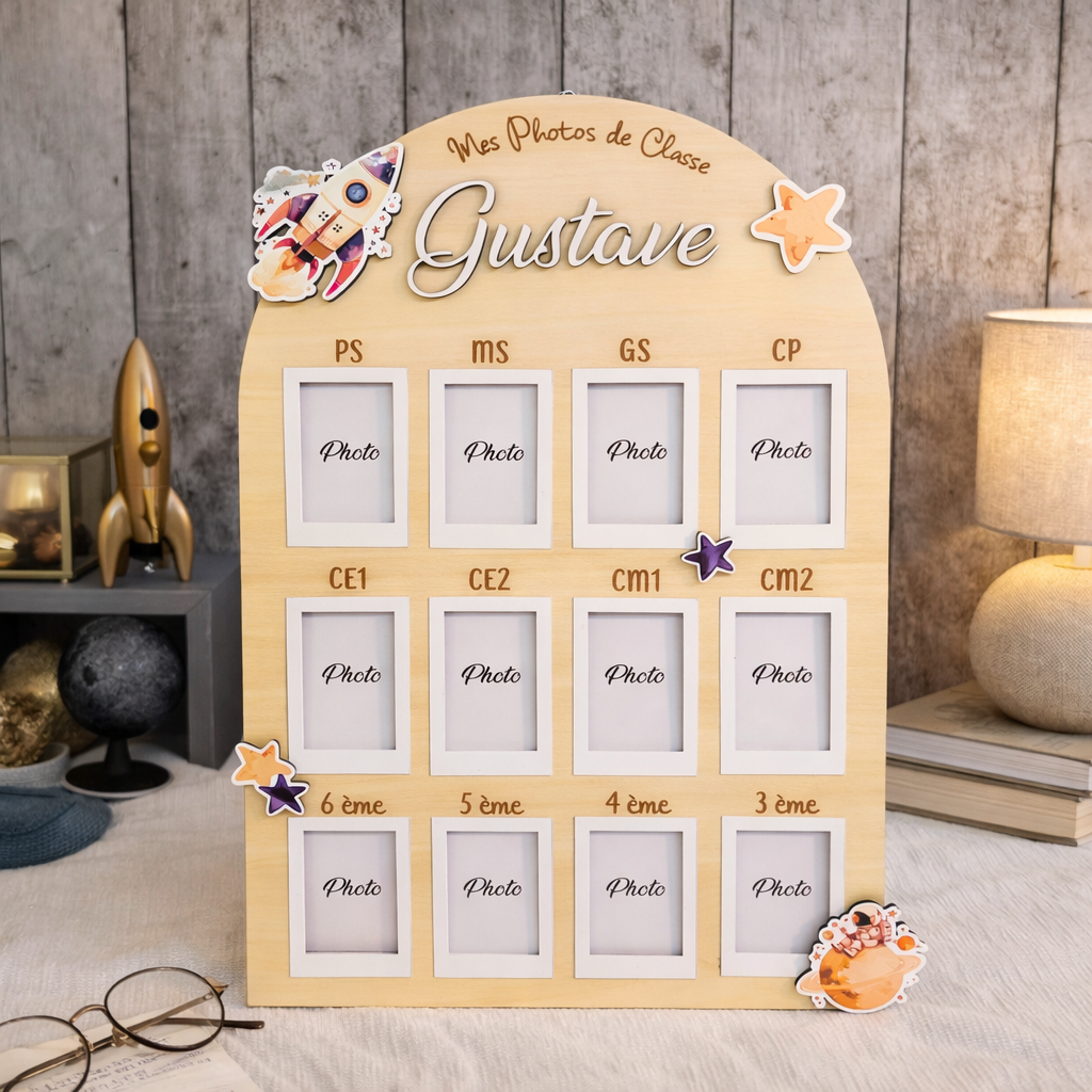 TITRE : Plaque Photos de Classe Personnalisée en Bois – Format A4 (2 modèles au choix)