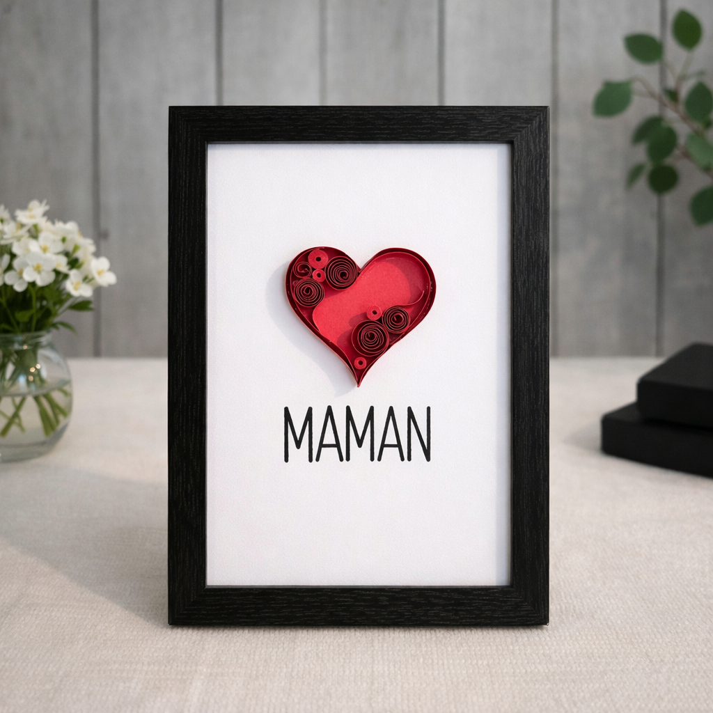 Ajoute une touche de douceur et d’émotion à ta décoration avec ce cadre en quilling « Maman » ou « Maman Bonus », une création artisanale délicate qui met à l’honneur l’amour et les liens du cœur ❤️