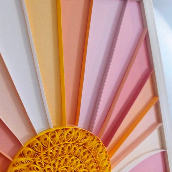 Ajoutez une touche de chaleur et de lumière à votre intérieur avec ce cadre en quilling inspiré du soleil, une création lumineuse qui évoque instantanément les couchers de soleil d’été.