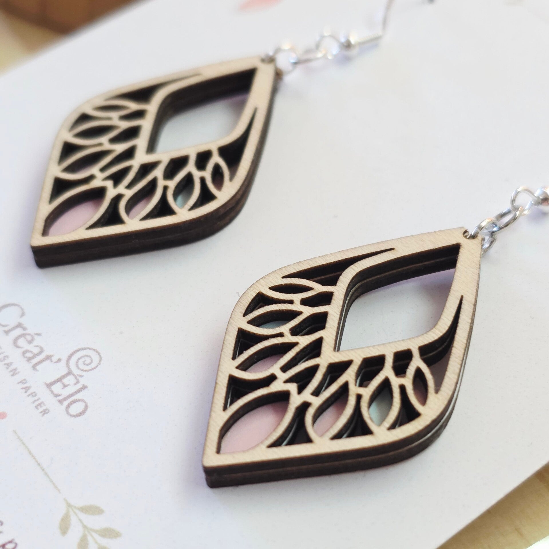 Boucles d’oreilles feuillage bois et vinyle pastel